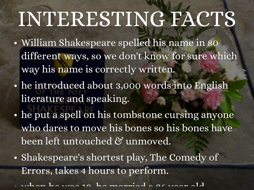 when he was 18, he married a 26 year old pregnant woman named Anne Hathaway -he introduced about 3,000 words into English literature and speaking.