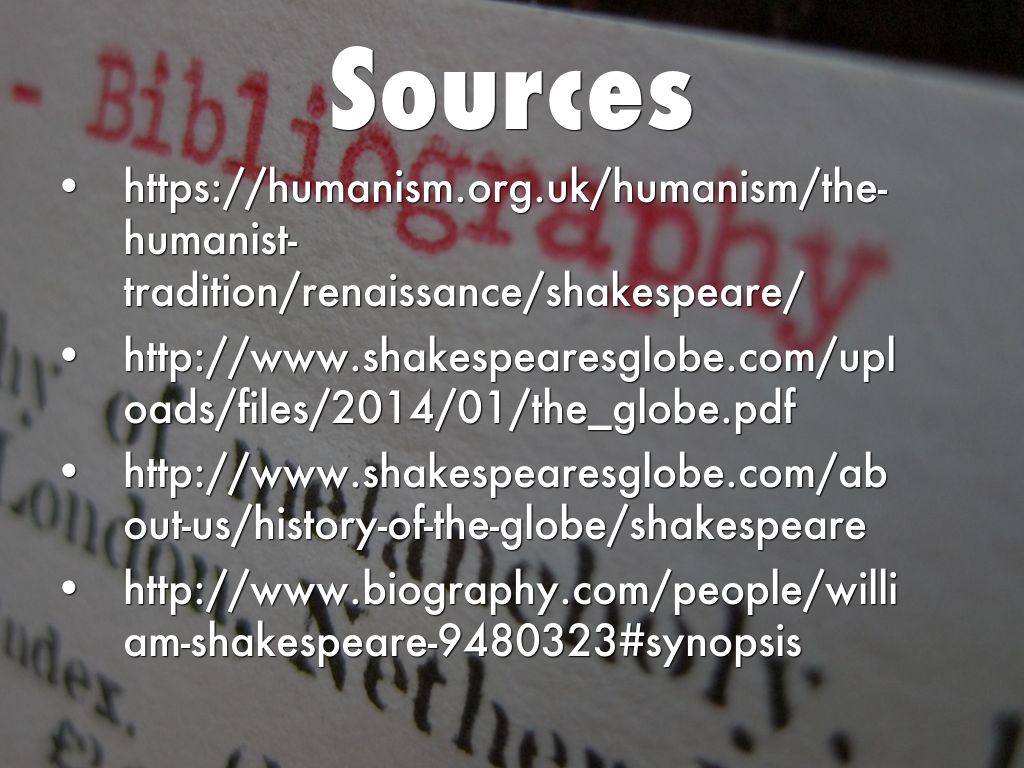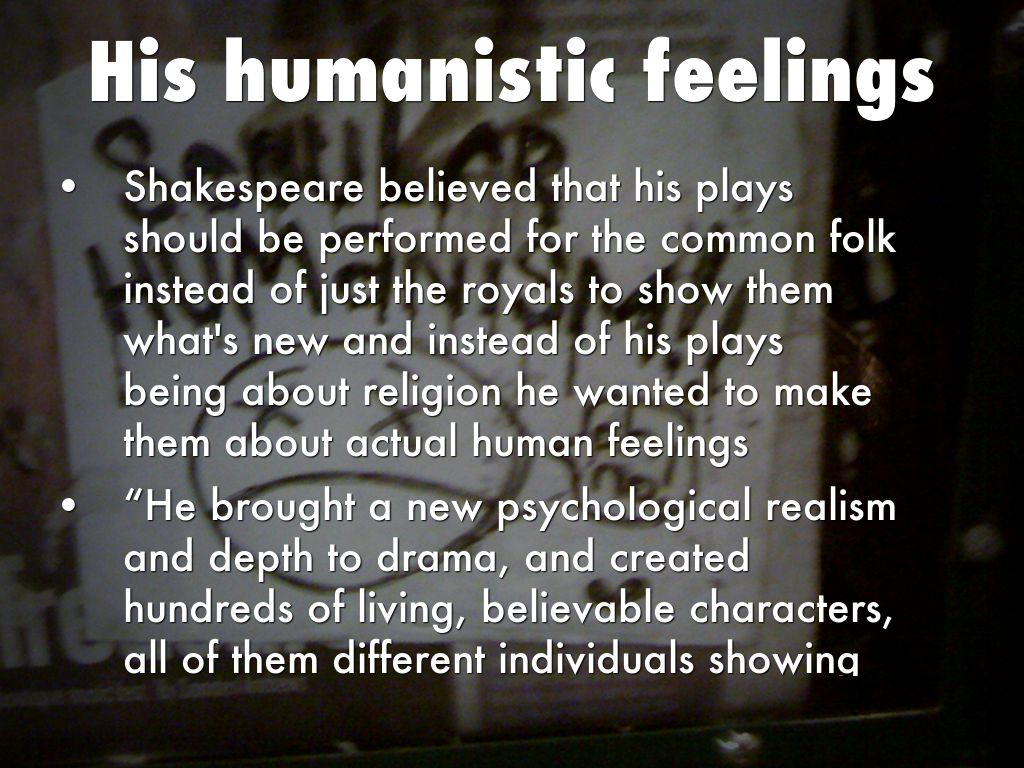 “He brought a new psychological realism and depth to drama, and created hundreds of living, believable characters, all of them different individuals showing the rich diversity of humanity.” In the quote it proves that Shakespeare was a humanist because he showed true emotion of a human in his plays that most things of this time lacked.
