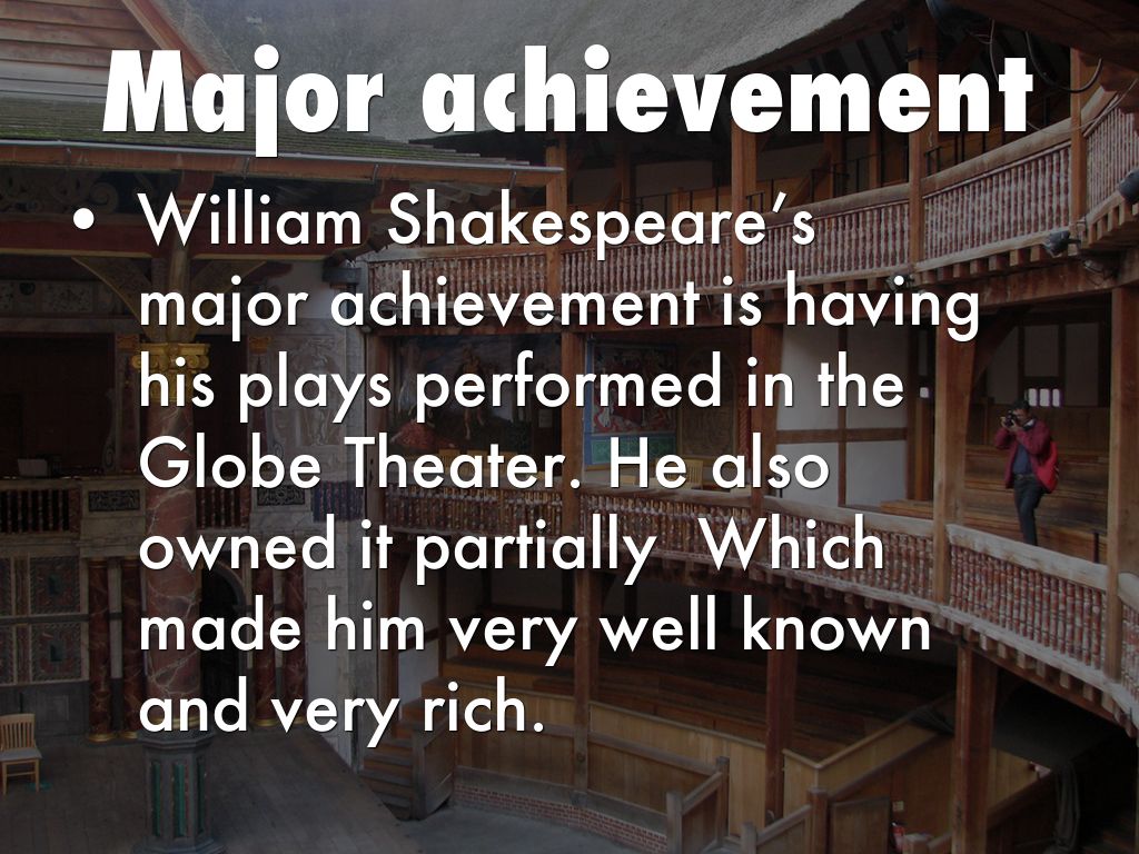 William Shakespeare’s major achievement is having his plays performed in the Globe Theater. He also owned it partially Which made him very well known and very rich.