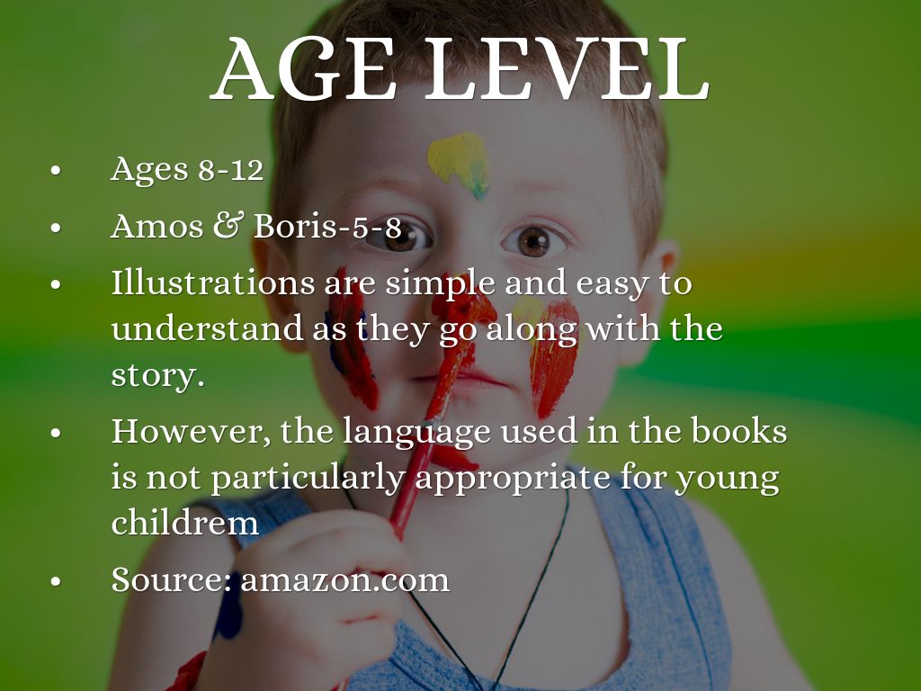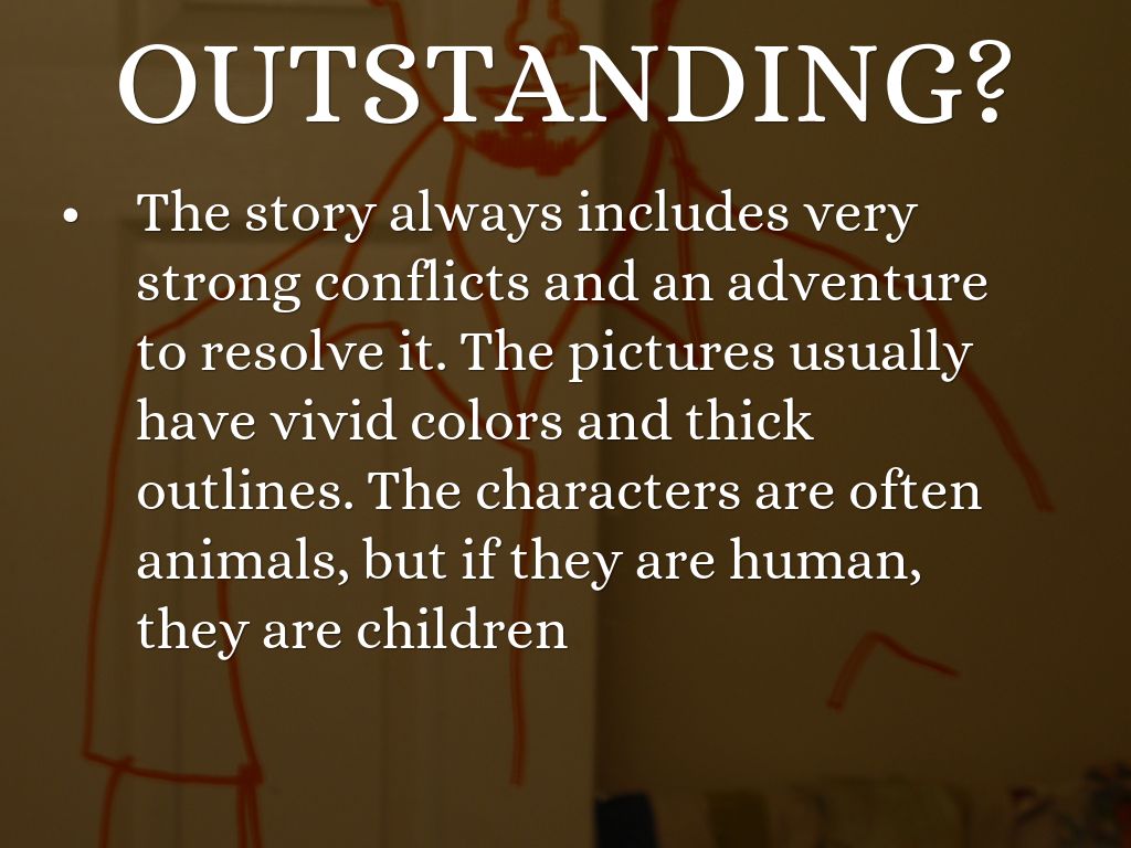 The story always includes very strong conflicts and an adventure to resolve it. The pictures usually have vivid colors and thick outlines. The characters are often animals, but if they are human, they are children