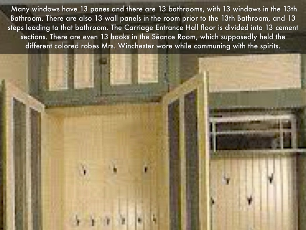 Many windows have 13 panes and there are 13 bathrooms, with 13 windows in the 13th Bathroom. There are also 13 wall panels in the room prior to the 13th Bathroom, and 13 steps leading to that bathroom. The Carriage Entrance Hall floor is divided into 13 cement sections. There are even 13 hooks in the Séance Room, which supposedly held the different colored robes Mrs. Winchester wore while communing with the spirits.