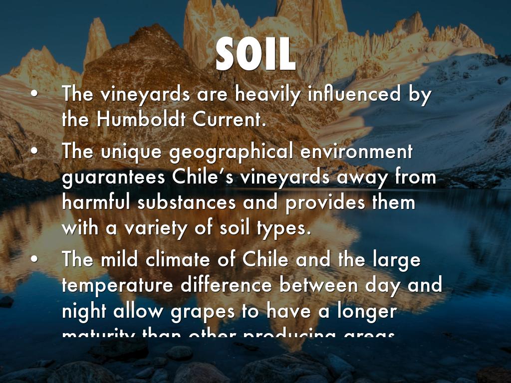 • The unique geographical environment guarantees Chile’s vineyards away from harmful substances and provides them with a variety of soil types.