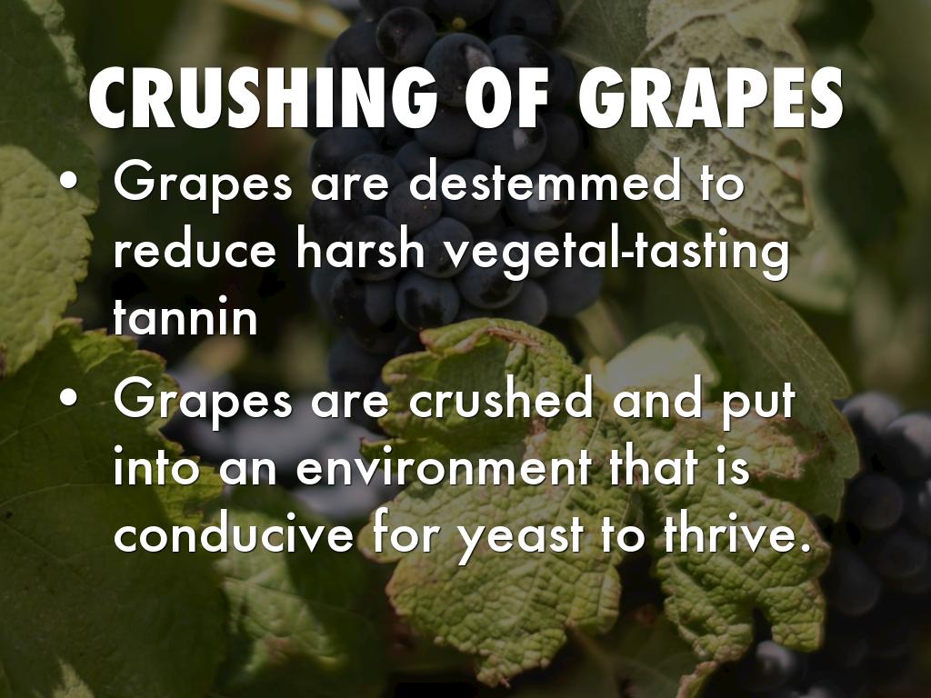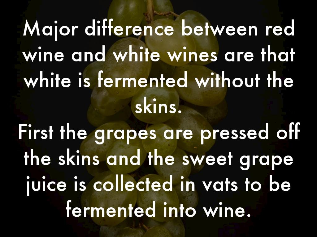 Major difference between red wine and white wines are that white is fermented without the skins. First the grapes are pressed off the skins and the sweet grape juice is collected in vats to be fermented into wine.
