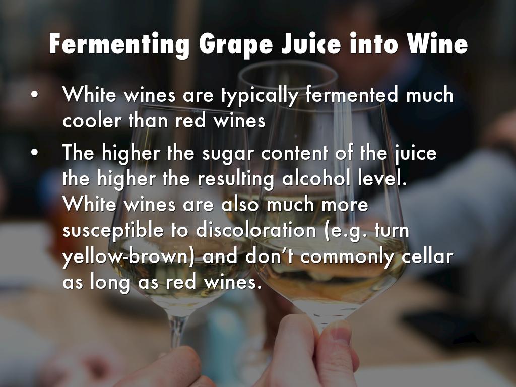 The higher the sugar content of the juice the higher the resulting alcohol level. White wines are also much more susceptible to discoloration (e.g. turn yellow-brown) and don’t commonly cellar as long as red wines.