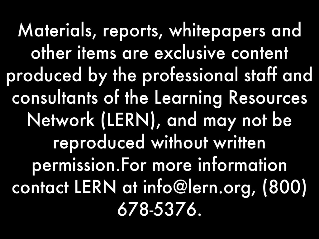 Materials, reports, whitepapers and other items are exclusive content produced by the professional staff and consultants of the Learning Resources Network (LERN), and may not be reproduced without written permission.For more information contact LERN at info@lern.org, (800) 678-5376.