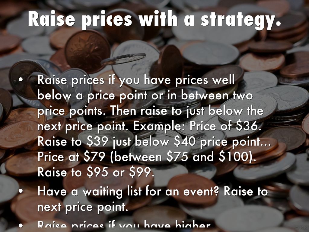 Raise prices if you have prices well below a price point or in between two price points. Then raise to just below the next price point. Example: Price of $36. Raise to $39 just below $40 price point... Price at $79 (between $75 and $100). Raise to $95 or $99.