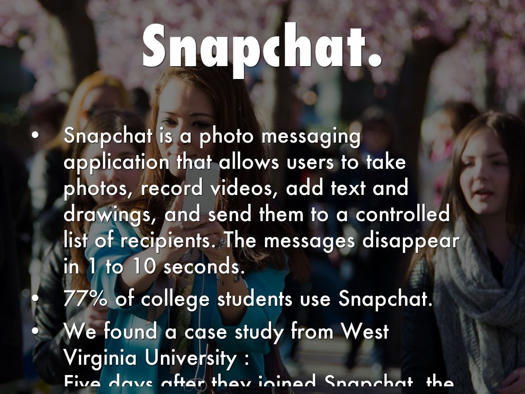 Snapchat is a photo messaging application that allows users to take photos, record videos, add text and drawings, and send them to a controlled list of recipients. The messages disappear in 1 to 10 seconds.