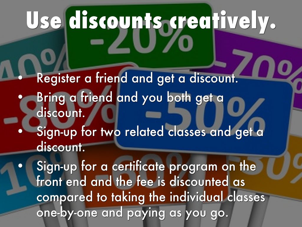 Sign-up for a certificate program on the front end and the fee is discounted as compared to taking the individual classes one-by-one and paying as you go.