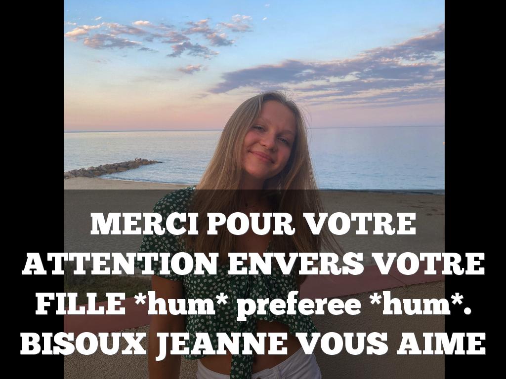 MERCI POUR VOTRE ATTENTION ENVERS VOTRE FILLE *hum* preferee *hum*. BISOUX JEANNE VOUS AIME