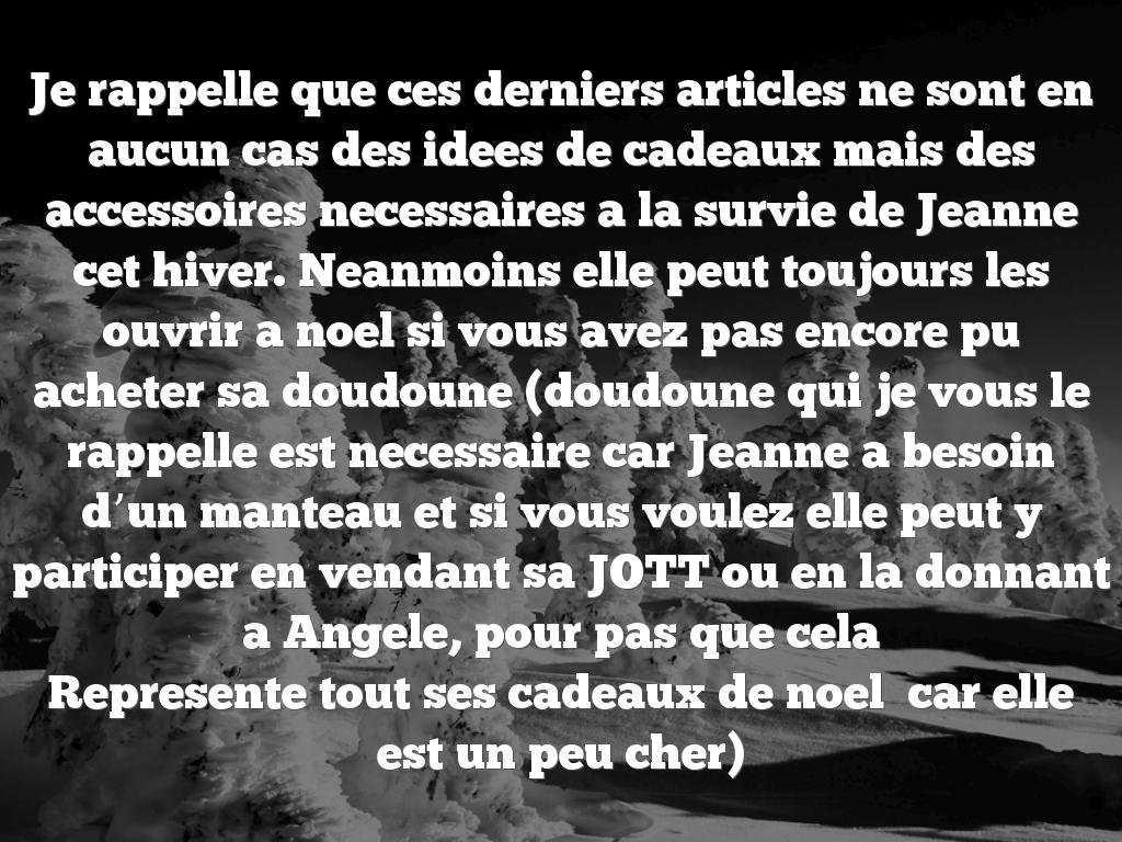 Je rappelle que ces derniers articles ne sont en aucun cas des idees de cadeaux mais des accessoires necessaires a la survie de Jeanne cet hiver. Neanmoins elle peut toujours les ouvrir a noel si vous avez pas encore pu acheter sa doudoune (doudoune qui je vous le rappelle est necessaire car Jeanne a besoin d’un manteau et si vous voulez elle peut y participer en vendant sa JOTT ou en la donnant a Angele, pour pas que cela