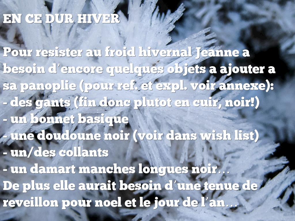 Pour resister au froid hivernal Jeanne a besoin d’encore quelques objets a ajouter a sa panoplie (pour ref. et expl. voir annexe):