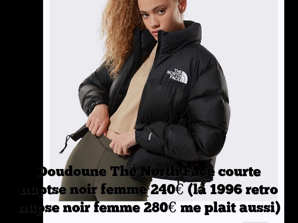 Doudoune The North Face courte nuptse noir femme 240€ (la 1996 retro nupse noir femme 280€ me plait aussi)