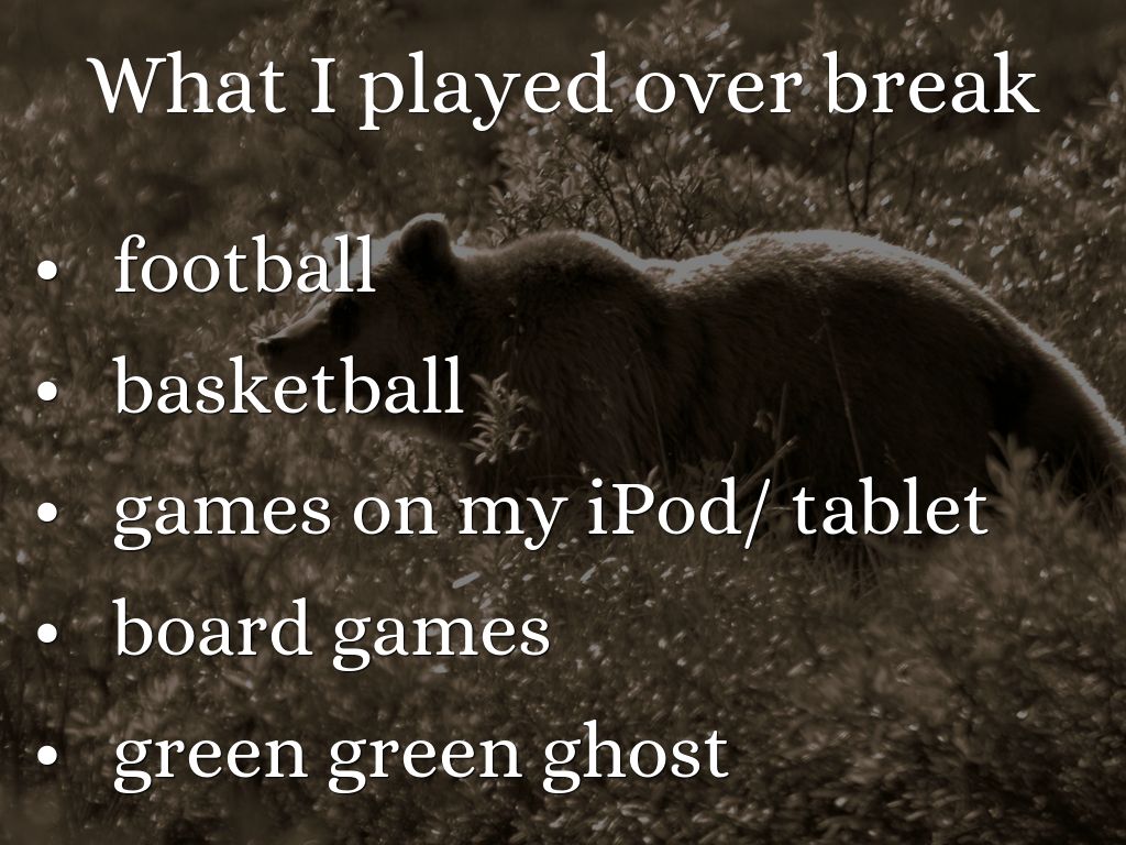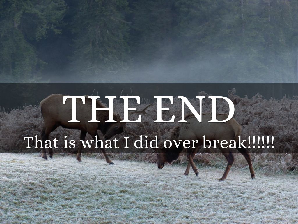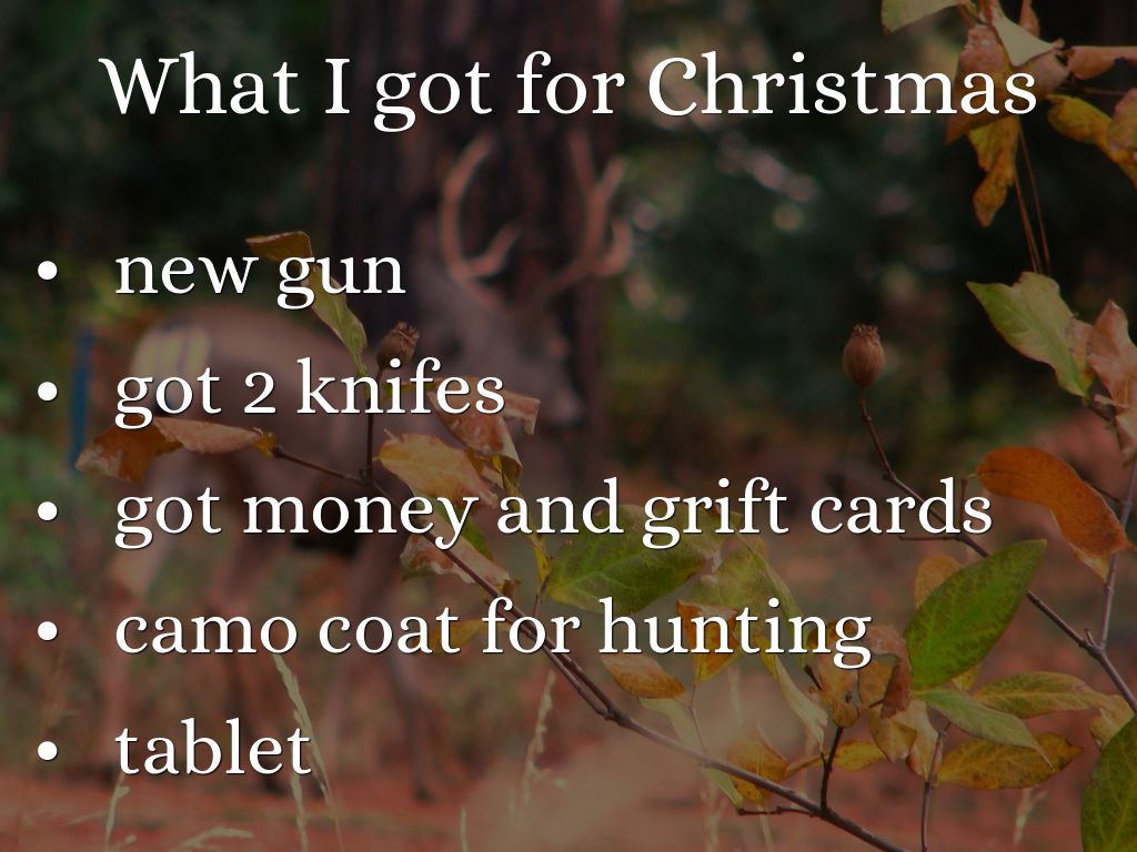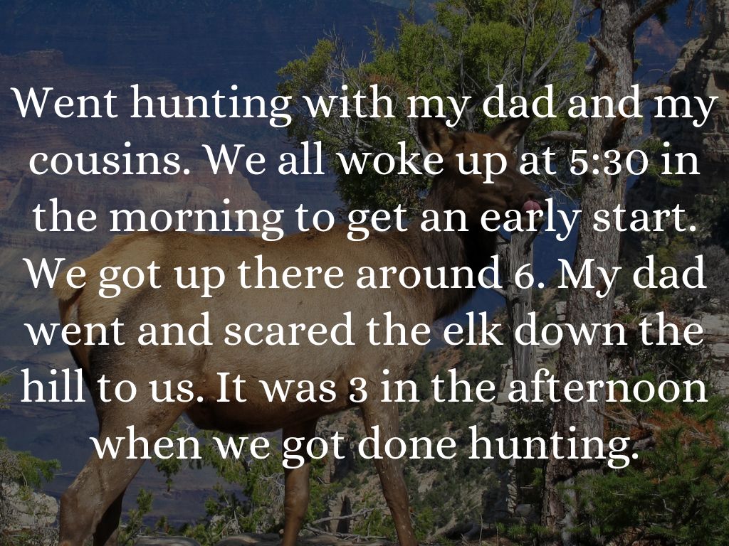 Went hunting with my dad and my cousins. We all woke up at 5:30 in the morning to get an early start. We got up there around 6. My dad went and scared the elk down the hill to us. It was 3 in the afternoon when we got done hunting.