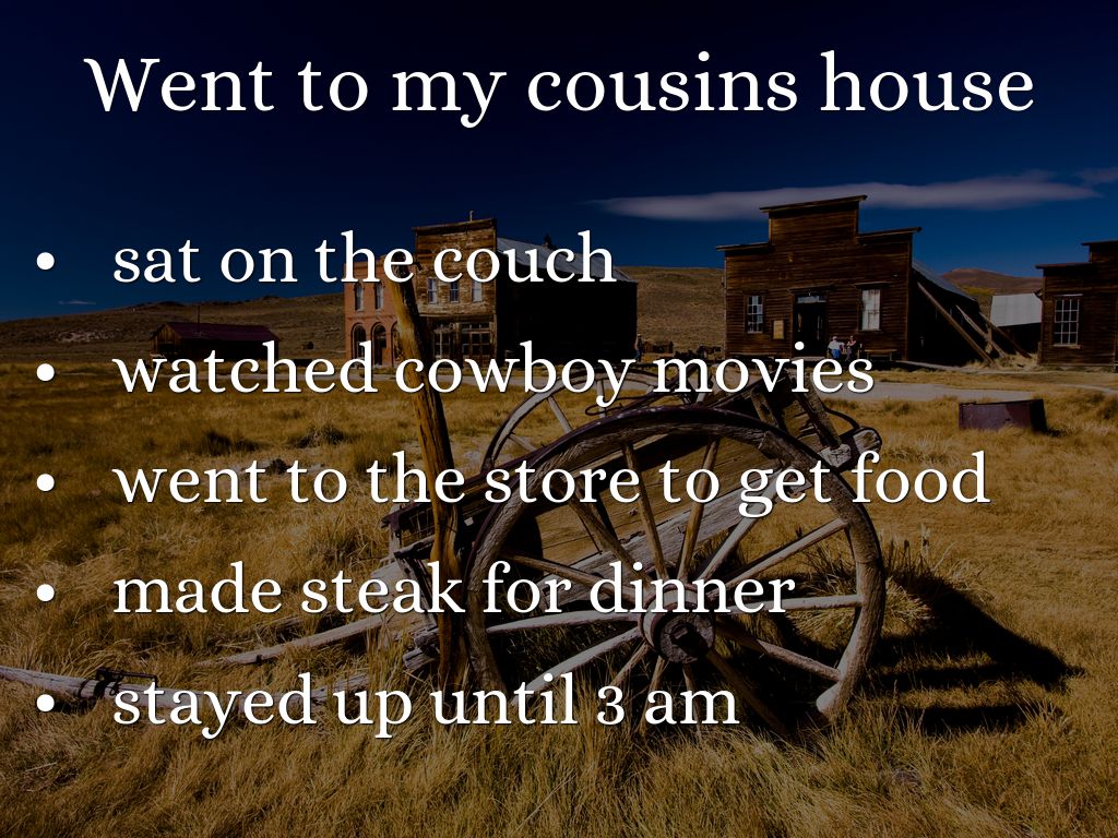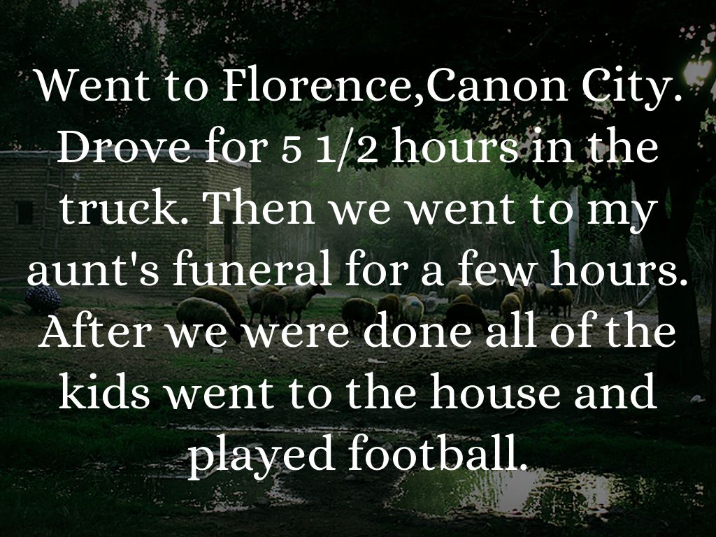Went to Florence,Canon City. Drove for 5 1/2 hours in the truck. Then we went to my aunt's funeral for a few hours. After we were done all of the kids went to the house and played football.