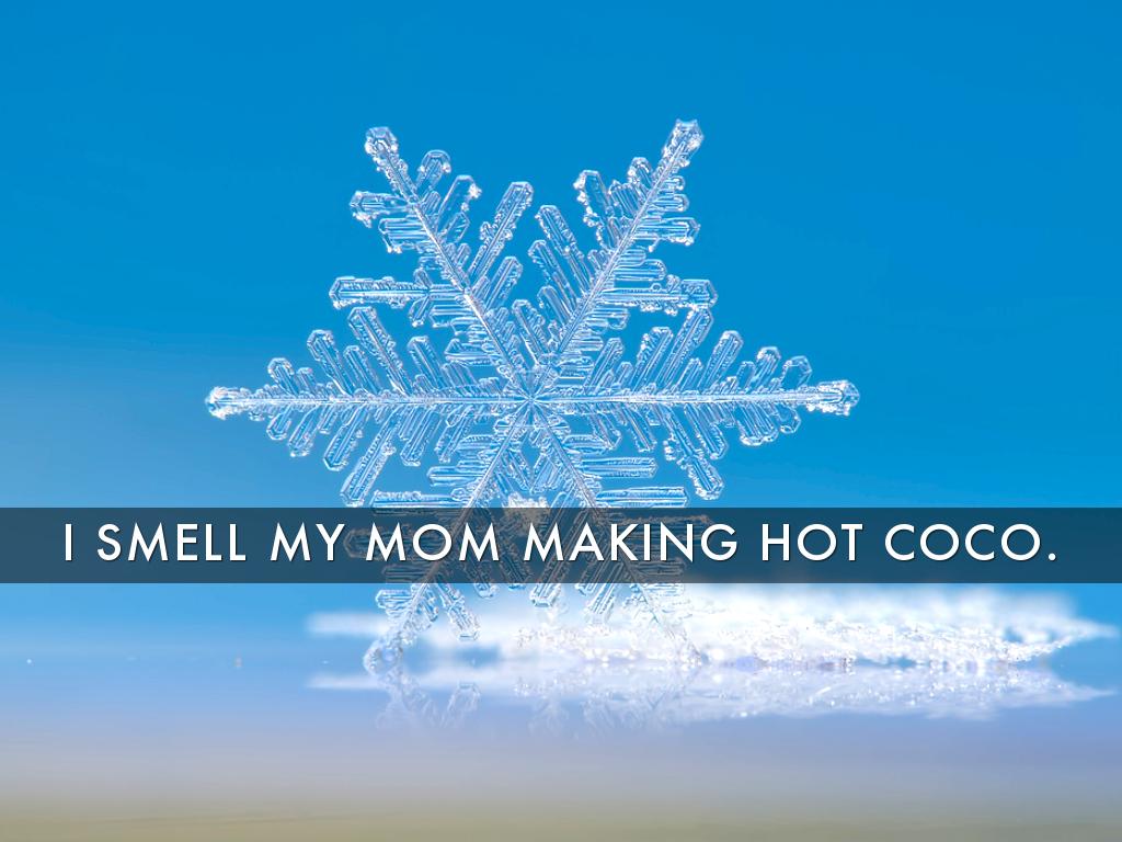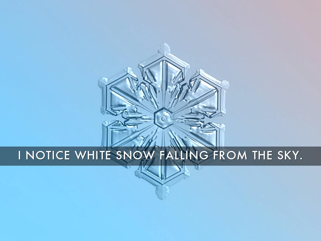 I NOTICE WHITE SNOW FALLING FROM THE SKY.