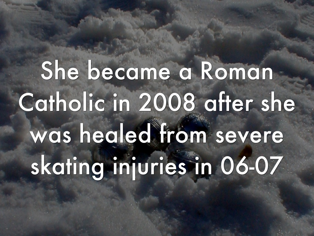 She became a Roman Catholic in 2008 after she was healed from severe skating injuries in 06-07