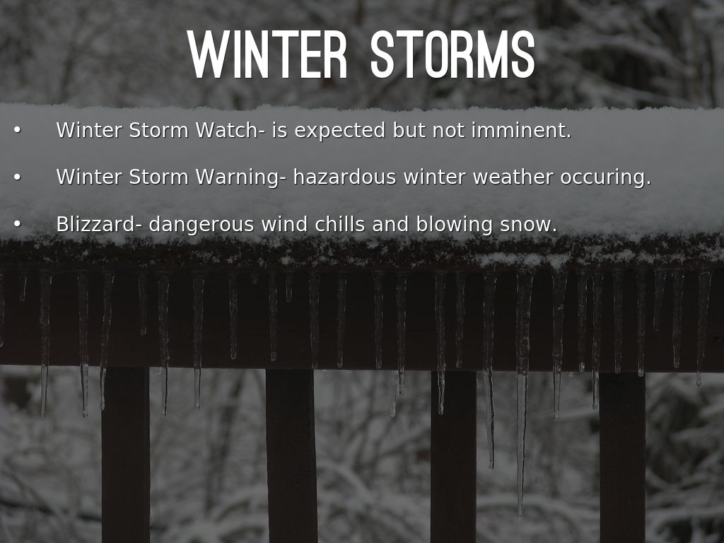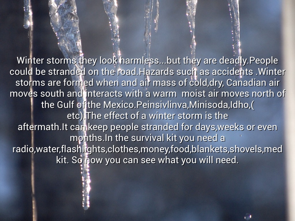Winter storms they look harmless...but they are deadly.People could be stranded on the road.Hazards such as accidents .Winter storms are formed when and air mass of cold,dry, Canadian air moves south and interacts with a warm moist air moves north of the Gulf of the Mexico.Peinsivlinva,Minisoda,Idho,( etc).The effect of a winter storm is the aftermath.It can keep people stranded for days,weeks or even months.In the survival kit you need a radio,water,flashlights,clothes,money,food,blankets,shovels,med kit. So now you can see what you will need.