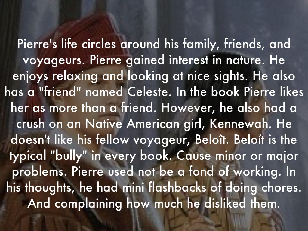 Pierre's life circles around his family, friends, and voyageurs. Pierre gained interest in nature. He enjoys relaxing and looking at nice sights. He also has a "friend" named Celeste. In the book Pierre likes her as more than a friend. However, he also had a crush on an Native American girl, Kennewah. He doesn't like his fellow voyageur, Beloît. Beloít is the typical "bully" in every book. Cause minor or major problems. Pierre used not be a fond of working. In his thoughts, he had mini flashbacks of doing chores. And complaining how much he disliked them.