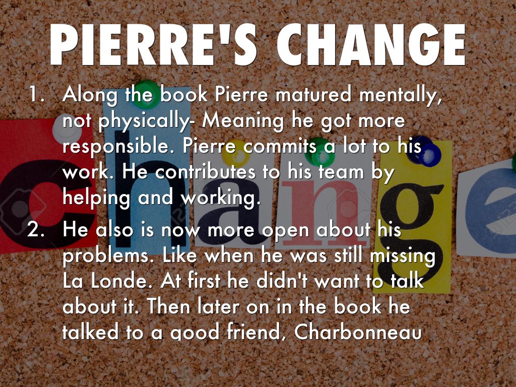 - Along the book Pierre matured mentally, not physically- Meaning he got more responsible. Pierre commits a lot to his work. He contributes to his team by helping and working.
