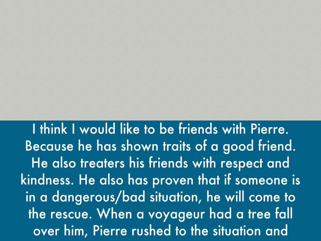 I think I would like to be friends with Pierre. Because he has shown traits of a good friend. He also treaters his friends with respect and kindness. He also has proven that if someone is in a dangerous/bad situation, he will come to the rescue. When a voyageur had a tree fall over him, Pierre rushed to the situation and helped.