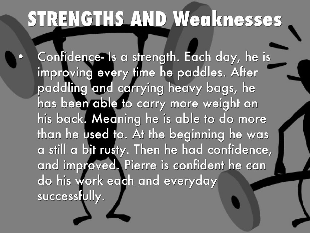 - Confidence- Is a strength. Each day, he is improving every time he paddles. After paddling and carrying heavy bags, he has been able to carry more weight on his back. Meaning he is able to do more than he used to. At the beginning he was a still a bit rusty. Then he had confidence, and improved. Pierre is confident he can do his work each and everyday successfully.
