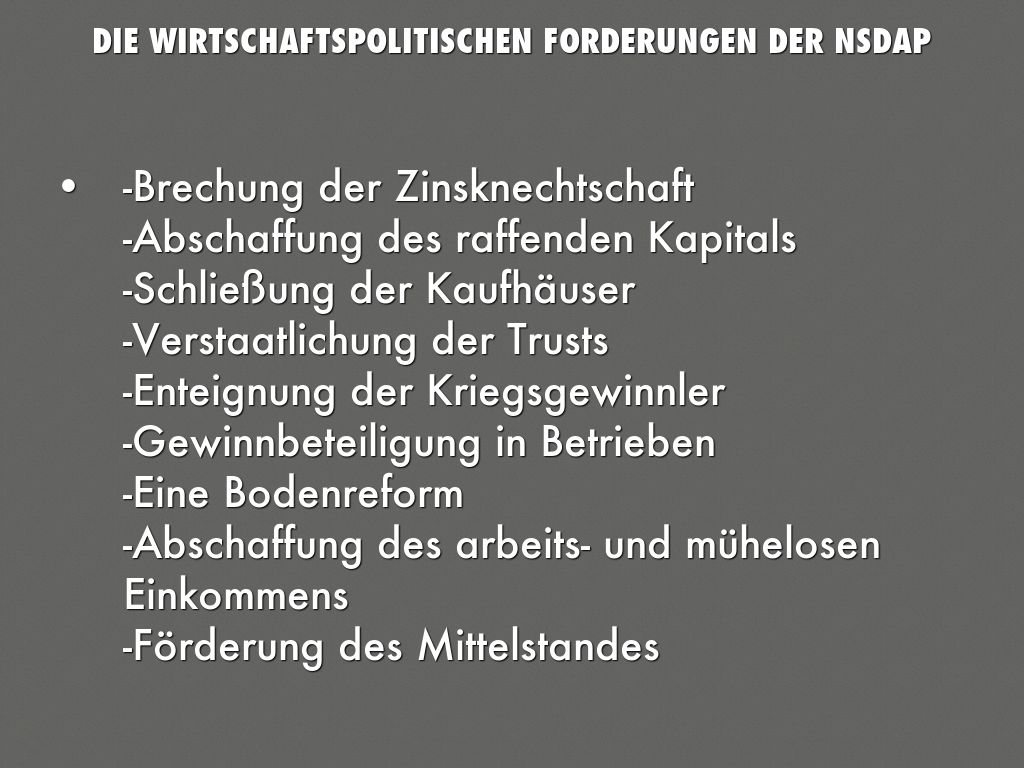 • -Brechung der Zinsknechtschaft -Abschaffung des raffenden Kapitals -Schließung der Kaufhäuser -Verstaatlichung der Trusts -Enteignung der Kriegsgewinnler -Gewinnbeteiligung in Betrieben -Eine Bodenreform -Abschaffung des arbeits- und mühelosen Einkommens -Förderung des Mittelstandes -Ausbau der Altersversorgung