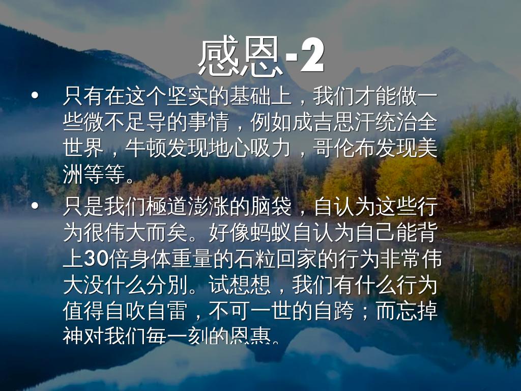只是我们極道澎涨的脑袋,自认为这些行为很伟大而矣。好像蚂蚁自认为自己能背上30倍身体重量的石粒回家的行为非常伟大没什么分別。试想想,我们有什么行为值得自吹自雷,不可一世的自跨;而忘掉神对我们毎一刻的恩惠。
