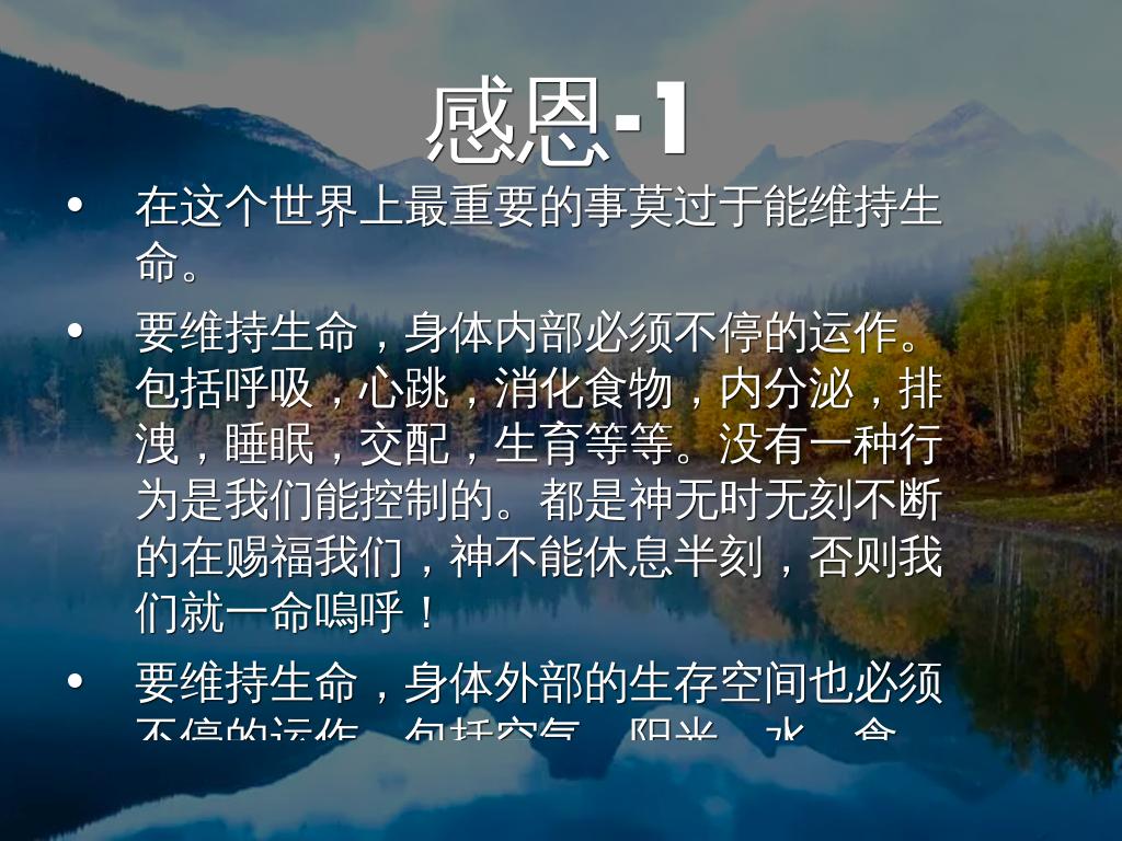 要维持生命,身体外部的生存空间也必须不停的运作。包括空气,阳光,水,食物,热能,从太空发出能邀活地球生物细胞的微波,等等。同样没有一样是我们能控制的,都是神的每刻不能断的赐福。