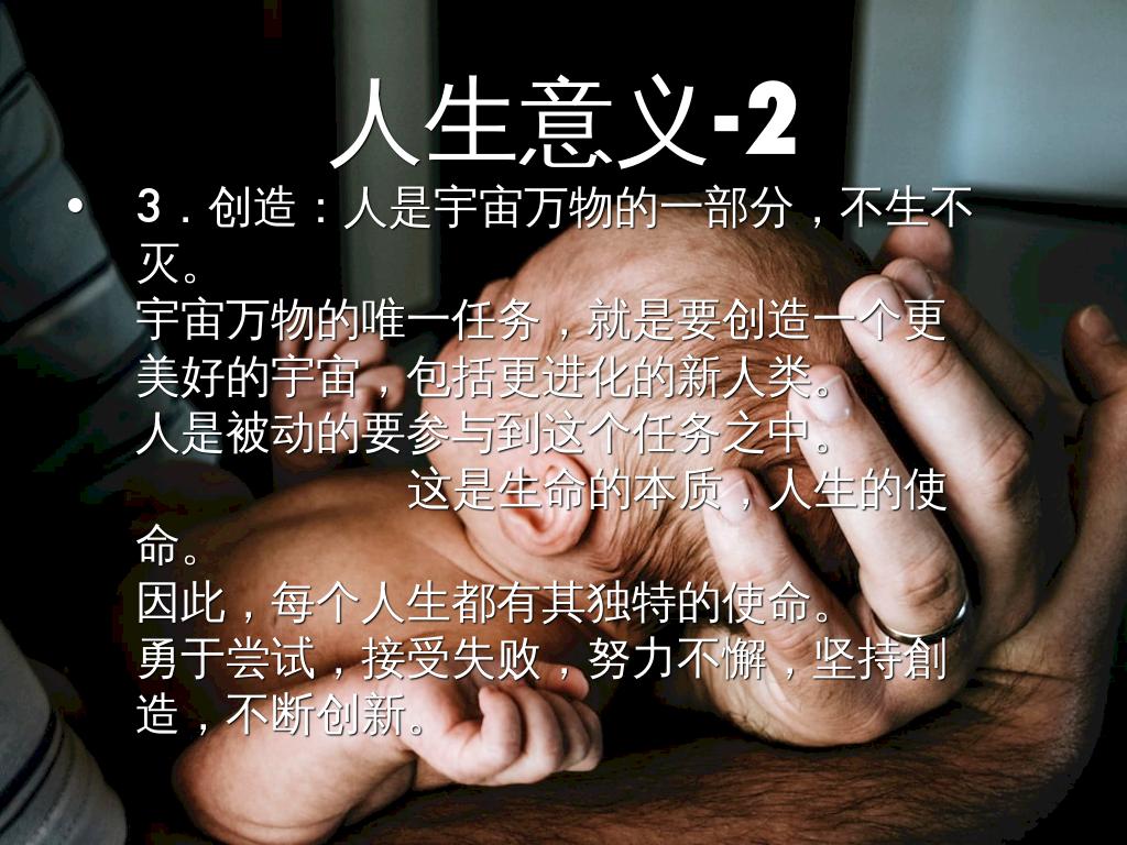 3.创造:人是宇宙万物的一部分,不生不灭。 宇宙万物的唯一任务,就是要创造一个更美好的宇宙,包括更进化的新人类。 人是被动的要参与到这个任务之中。 这是生命的本质,人生的使命。 因此,每个人生都有其独特的使命。 勇于尝试,接受失败,努力不懈,坚持創造,不断创新。