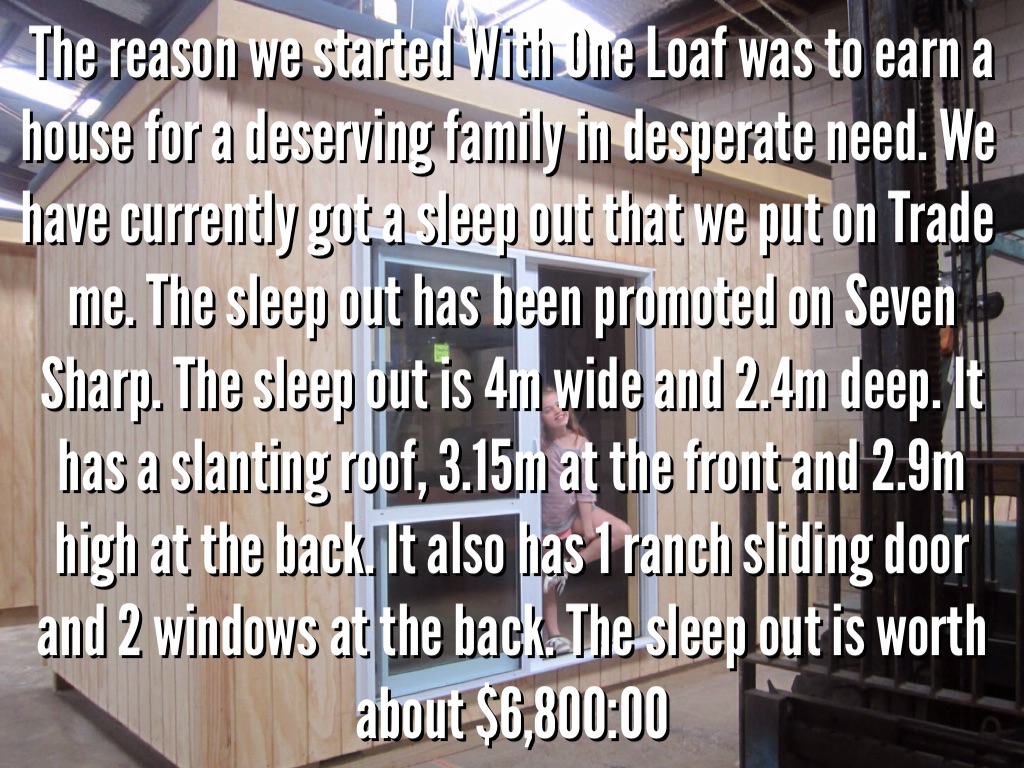 The reason we started With One Loaf was to earn a house for a deserving family in desperate need. We have currently got a sleep out that we put on Trade me. The sleep out has been promoted on Seven Sharp. The sleep out is 4m wide and 2.4m deep. It has a slanting roof, 3.15m at the front and 2.9m high at the back. It also has 1 ranch sliding door and 2 windows at the back. The sleep out is worth about $6,800:00