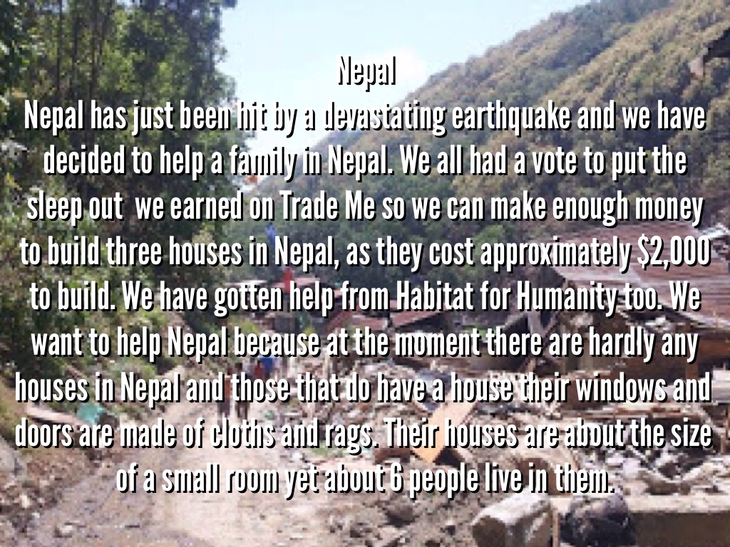 Nepal has just been hit by a devastating earthquake and we have decided to help a family in Nepal. We all had a vote to put the sleep out we earned on Trade Me so we can make enough money to build three houses in Nepal, as they cost approximately $2,000 to build. We have gotten help from Habitat for Humanity too. We want to help Nepal because at the moment there are hardly any houses in Nepal and those that do have a house their windows and doors are made of cloths and rags. Their houses are about the size of a small room yet about 6 people live in them.