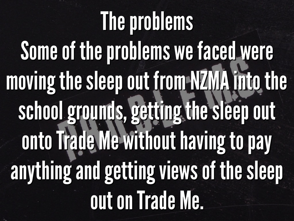 Some of the problems we faced were moving the sleep out from NZMA into the school grounds, getting the sleep out onto Trade Me without having to pay anything and getting views of the sleep out on Trade Me.