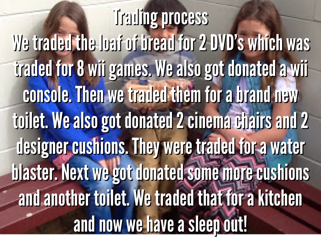 We traded the loaf of bread for 2 DVD's which was traded for 8 wii games. We also got donated a wii console. Then we traded them for a brand new toilet. We also got donated 2 cinema chairs and 2 designer cushions. They were traded for a water blaster. Next we got donated some more cushions and another toilet. We traded that for a kitchen and now we have a sleep out!