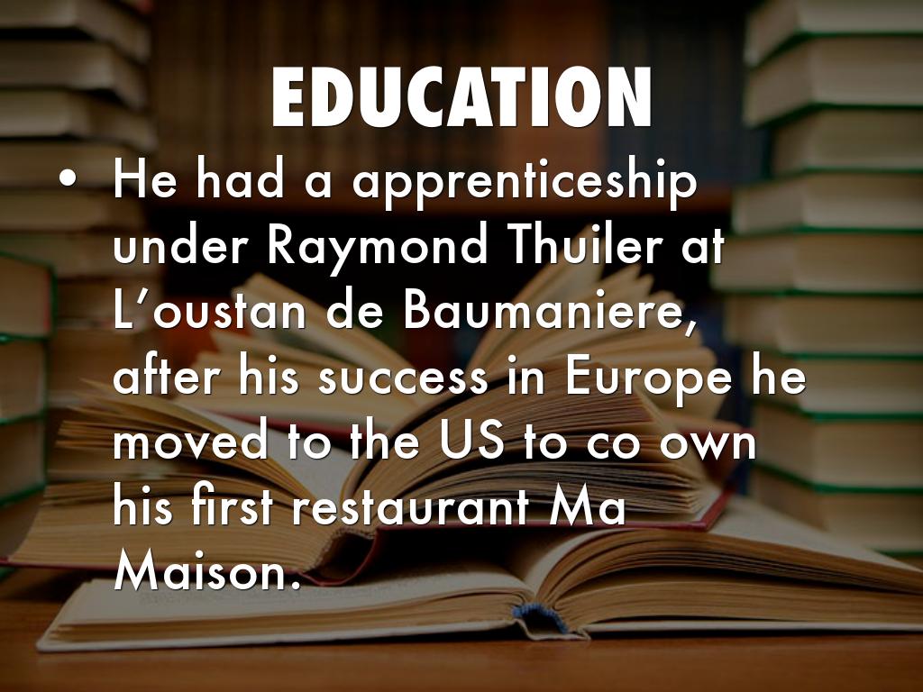 He had a apprenticeship under Raymond Thuiler at L’oustan de Baumaniere, after his success in Europe he moved to the US to co own his first restaurant Ma Maison.