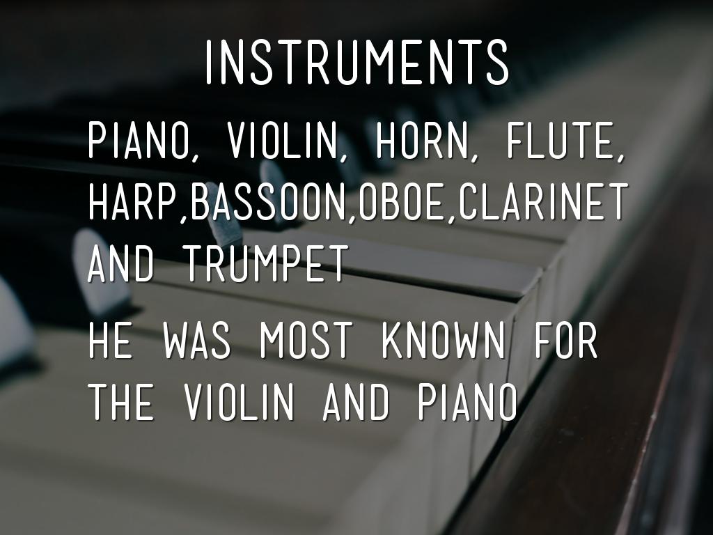 Mozart played a lot of instruments including piano,violin, horn, flute, harp bassoon, oboe and,clarinets and trumpet out of all those he was best known for the violin and piano