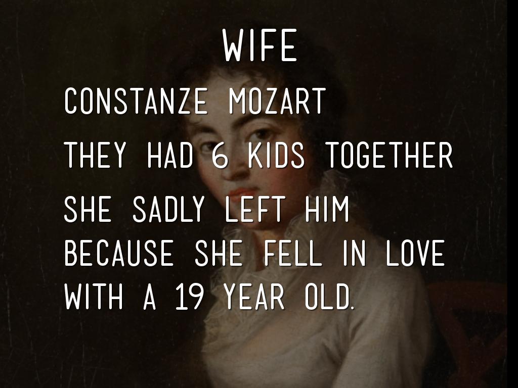 He had a wife named constanze Mozart they has 6 kids together they will be listed on the next page. But sadly on top of all of that she left him in 1782 because she had an episode involving jealousy.