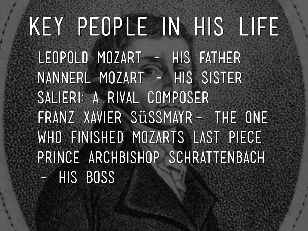 • Leopold Mozart - his father Nannerl Mozart - his sister Salieri: a rival composer Franz Xavier Süssmayr- the one who finished Mozarts last piece Prince Archbishop Schrattenbach - his boss