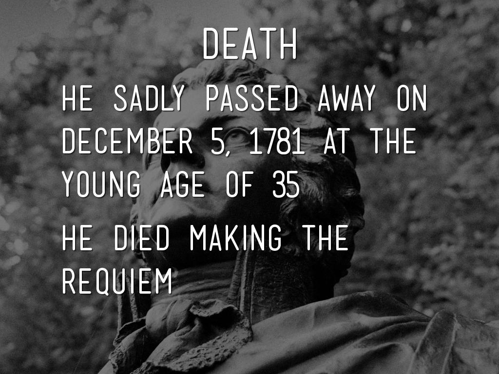 He sadly passed away on December 5,1781 at the young age of 35. He died making a funeral song called the requiem