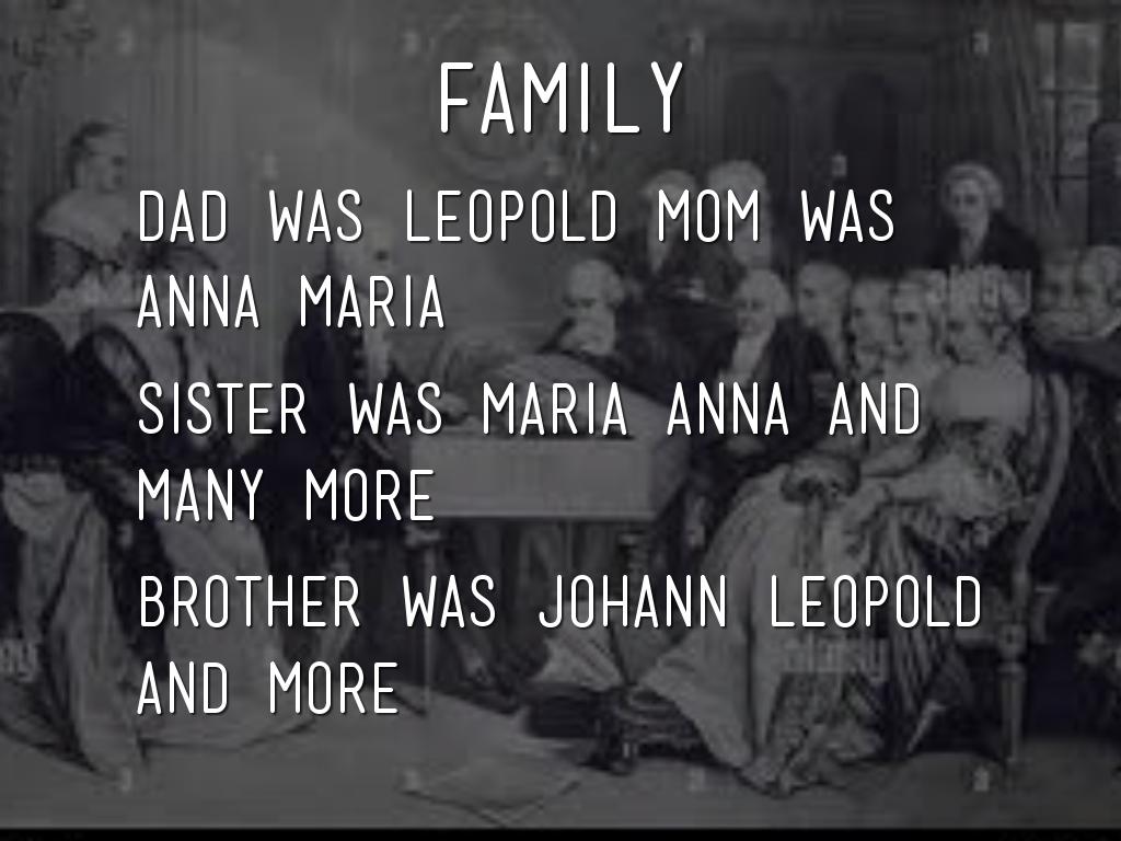 To Mozart and many others family was very important so here was Mozarts wonderful family. His was was leopold his mom was Anna Maria. He had many siblings to start off sisters he had one sister named Maria Anna and many more they will be listed on the next page. And he had a couple of brothers one is johann leopold and more on the next page