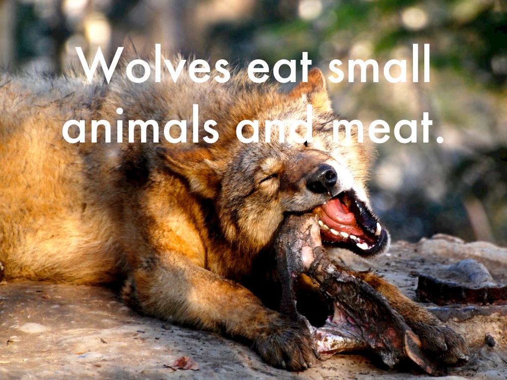 Wolves eat small animals and meat.