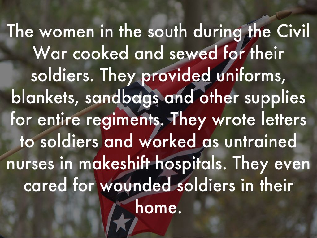 The women in the south during the Civil War cooked and sewed for their soldiers. They provided uniforms, blankets, sandbags and other supplies for entire regiments. They wrote letters to soldiers and worked as untrained nurses in makeshift hospitals. They even cared for wounded soldiers in their home.
