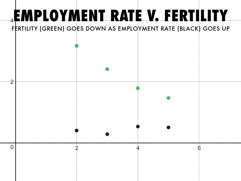 FERTILITY (GREEN) GOES DOWN AS EMPLOYMENT RATE (BLACK) GOES UP