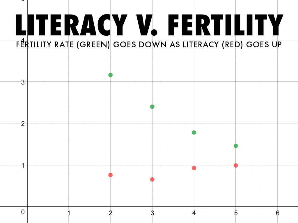 FERTILITY RATE (GREEN) GOES DOWN AS LITERACY (RED) GOES UP