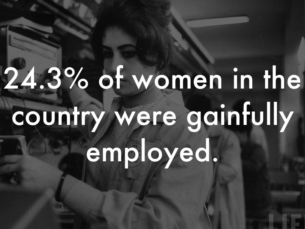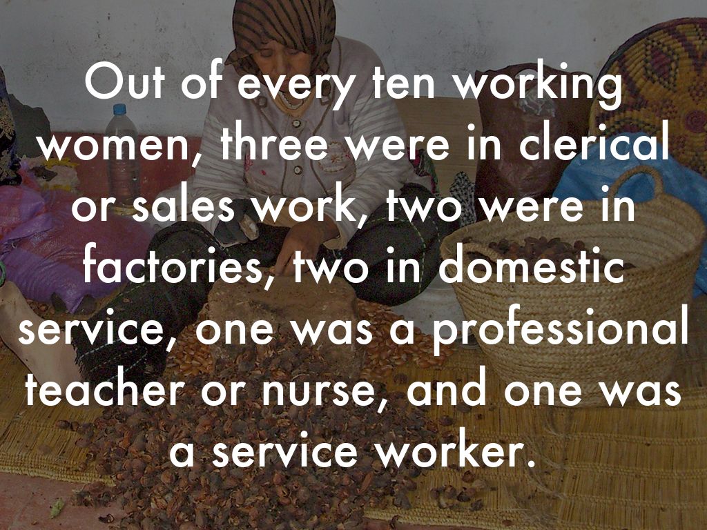 Out of every ten working women, three were in clerical or sales work, two were in factories, two in domestic service, one was a professional teacher or nurse, and one was a service worker.
