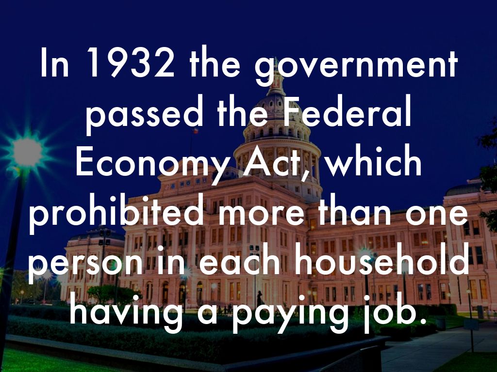 In 1932 the government passed the Federal Economy Act, which prohibited more than one person in each household having a paying job.