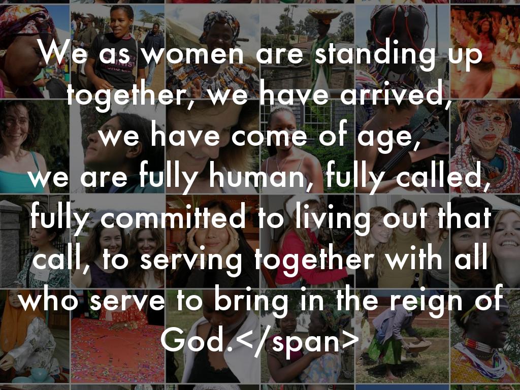 We as women are standing up together, we have arrived, we have come of age, we are fully human, fully called, fully committed to living out that call, to serving together with all who serve to bring in the reign of God.