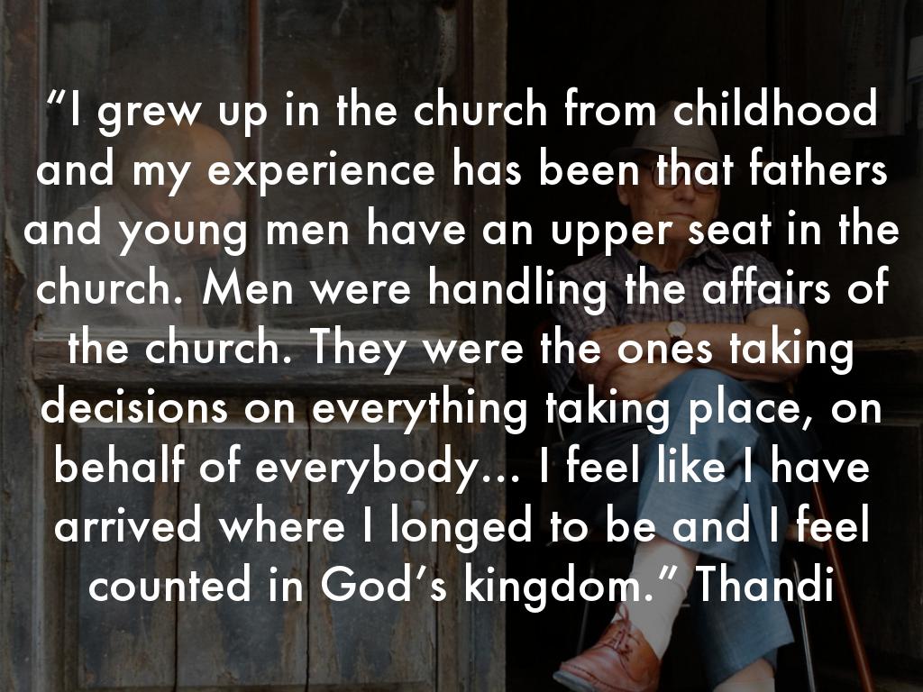 “I grew up in the church from childhood and my experience has been that fathers and young men have an upper seat in the church. Men were handling the affairs of the church. They were the ones taking decisions on everything taking place, on behalf of everybody... I feel like I have arrived where I longed to be and I feel counted in God’s kingdom.” Thandi
