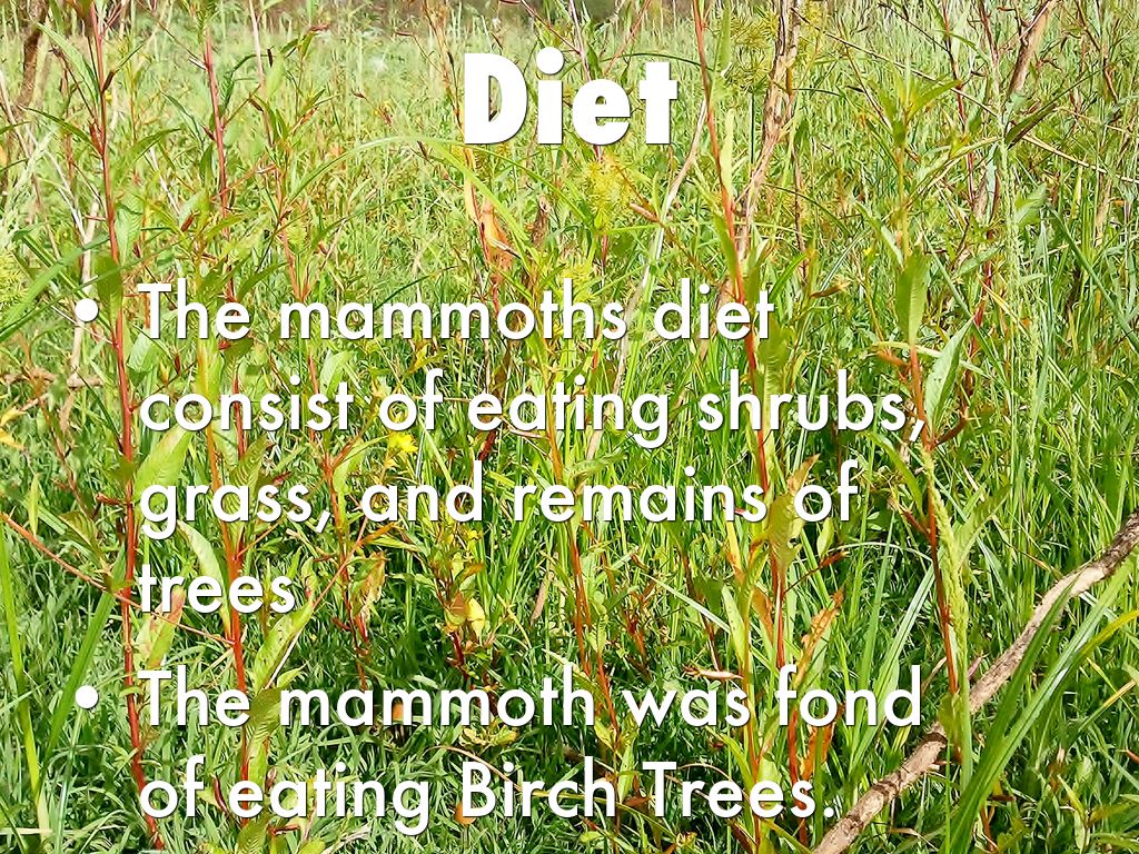 The mammoths diet consist of eating shrubs, grass, and remains of trees