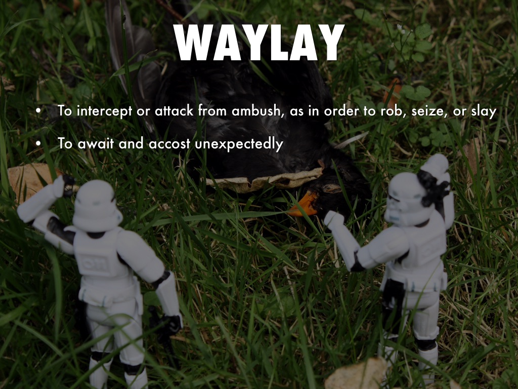 To intercept or attack from ambush, as in order to rob, seize, or slay