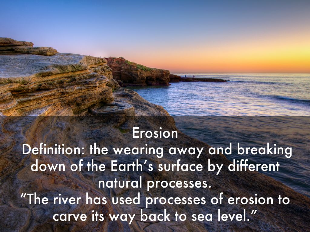Erosion Definition: the wearing away and breaking down of the Earth’s surface by different natural processes. “The river has used processes of erosion to carve its way back to sea level.”
